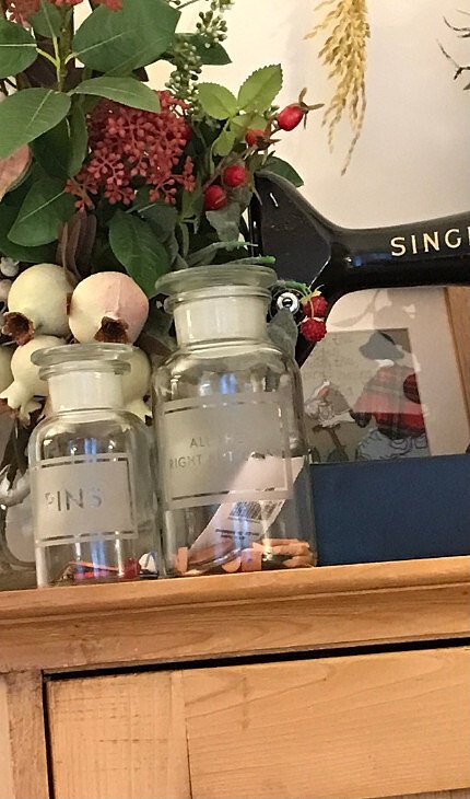 Jars for buttons and pins and Grandma's Singer sewing machine xx