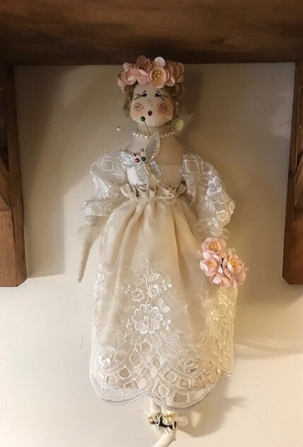 Wedding fairy doll with beautiful butterfly, lace sleeves and Christmas fairy for new grand daughter satin bodice and dress in lace to match, peach head dress and bouquet and lace sleeves xxand pearl necklace xx