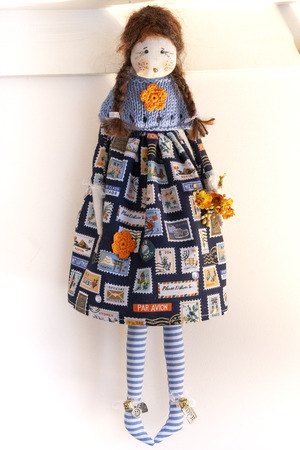 Do you remember your first needlework lesson ? A piece of checked fabric to make an apron with rows of cross stitches, this is my version in a pretty fairy doll with giant crochet flowers xx