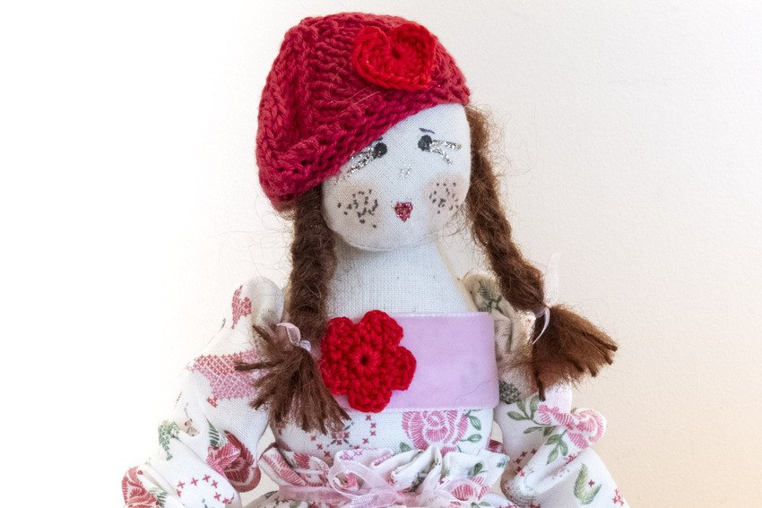 - Hand knitted red beret with crochet heart