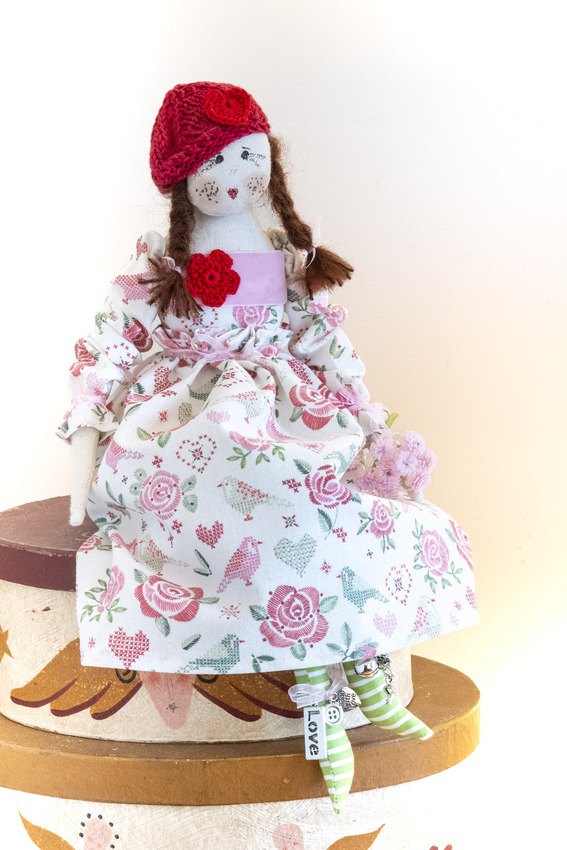 Daphne sitting in her roses and birds soft delicate dress with matching sleeves, velvet edging, striped stockings and handmade beret and as always not to forget glitter lipstick and eyelashes xx