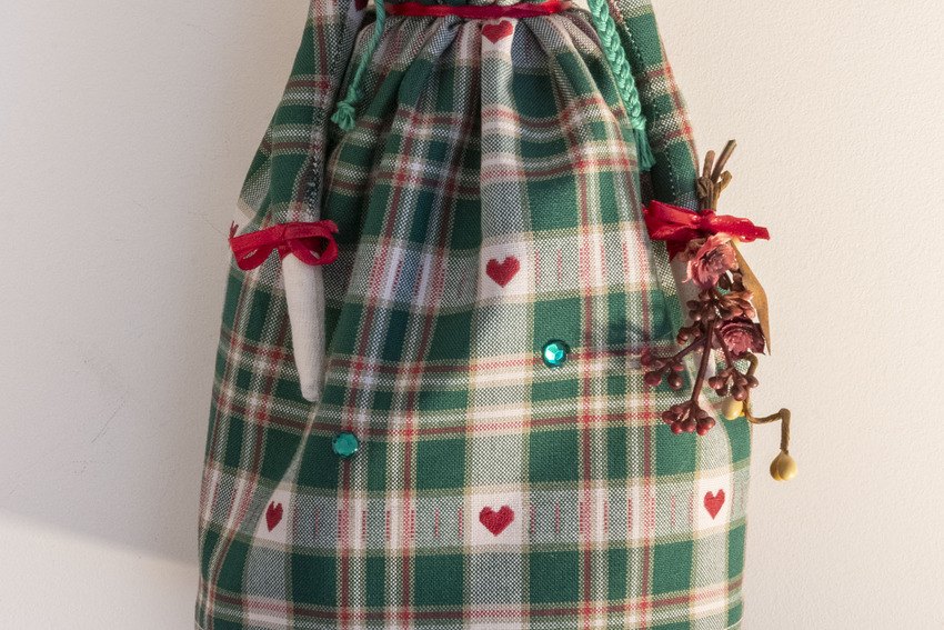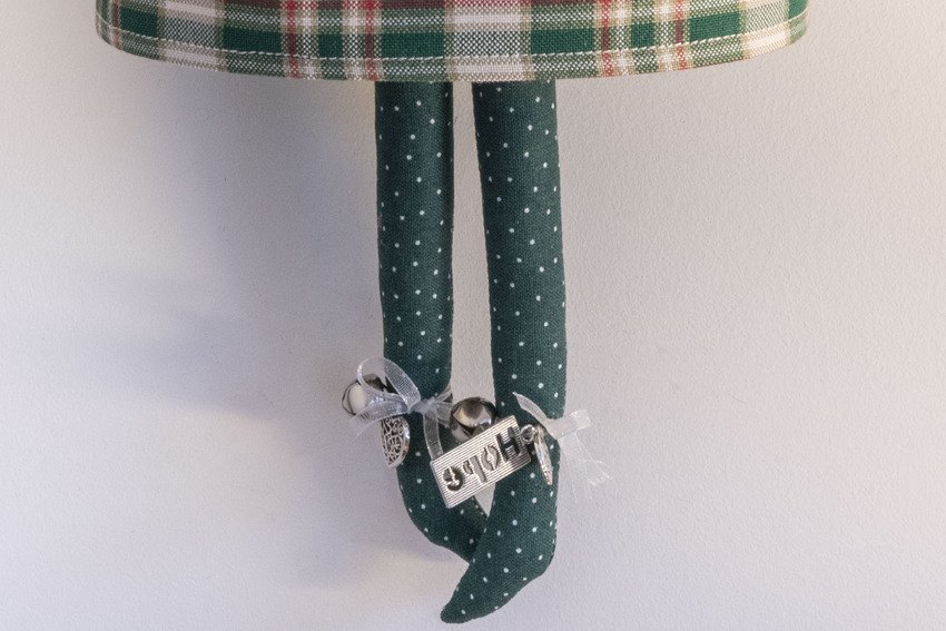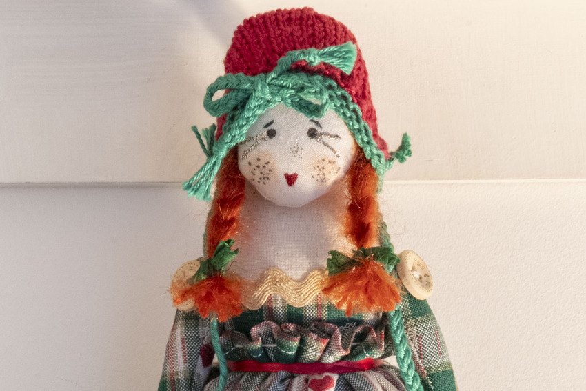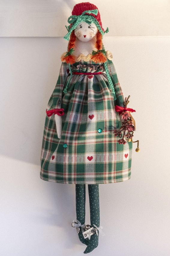 Hope in her green and cream checked print dress with hearts, matching sleeves, tea dyed ric rac edging, polka dot stockings, hand knitted hat with bow and as always not to forget glitter lipstick and eyelashes xx