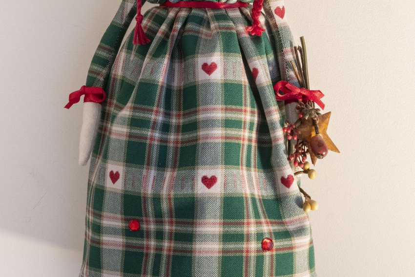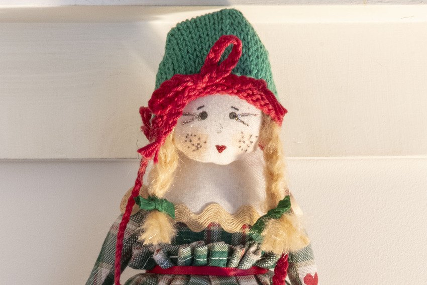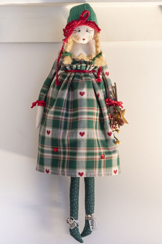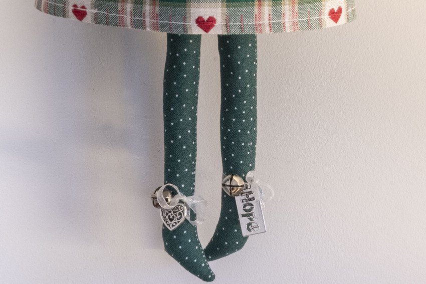 Jesse in her green and cream checked print dress with hearts, matching sleeves, tea dyed ric rac edging, polka dot stockings, hand knitted hat with bow and as always not to forget glitter lipstick and eyelashes xx