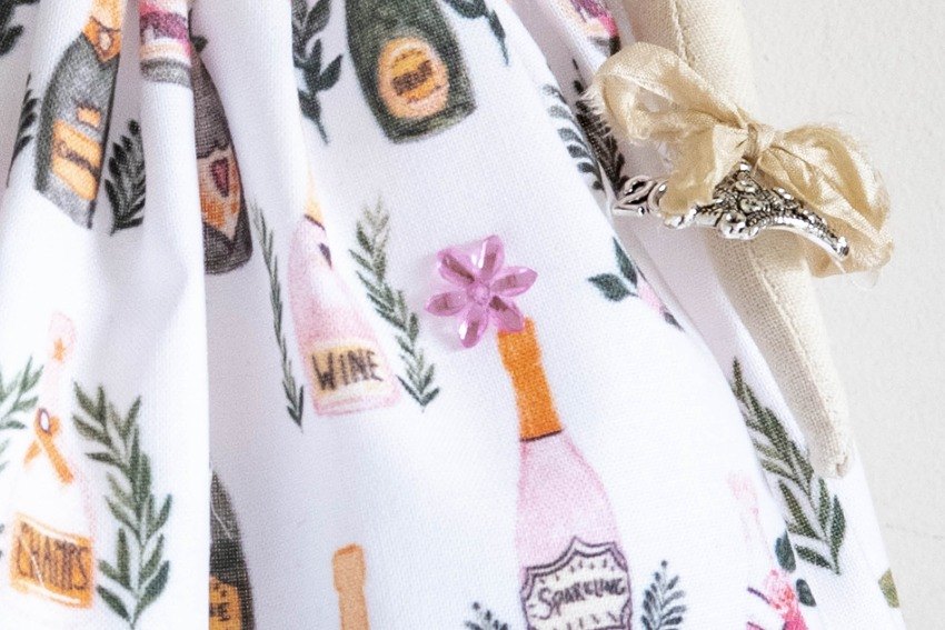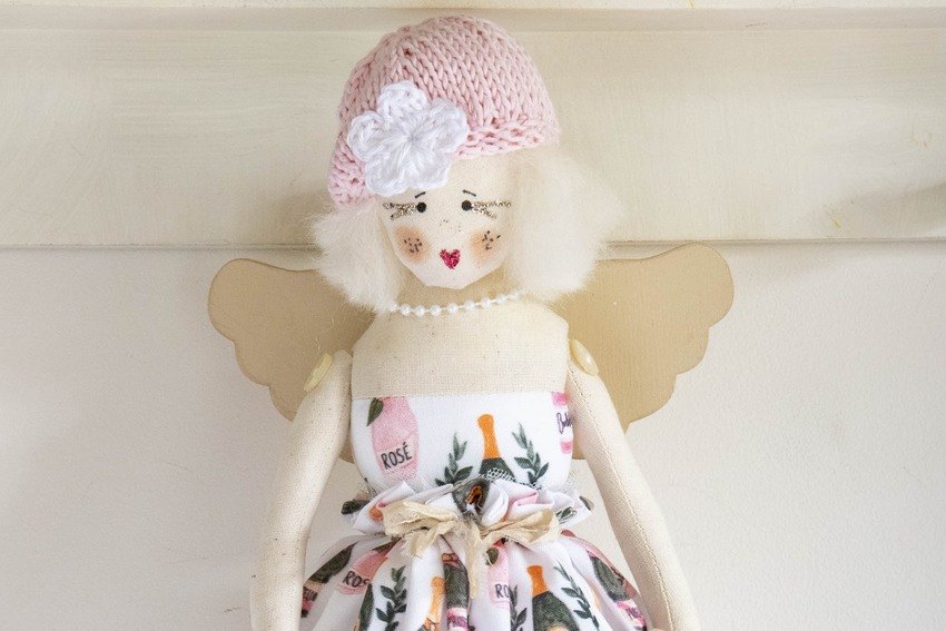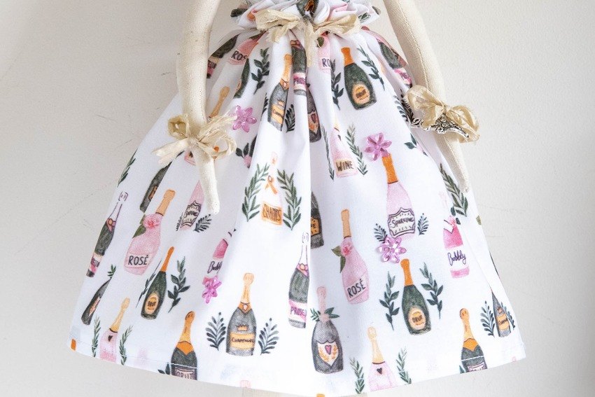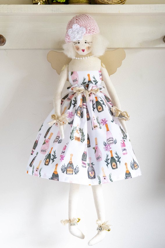 Lulu has a beautiful white dress with champagne and sparkling wine bottles, a handmade pale pink knitted hat with a crown and 2021 silver charms, and New handmade painted wooden wings, glitter lipstick and eyelashes xx