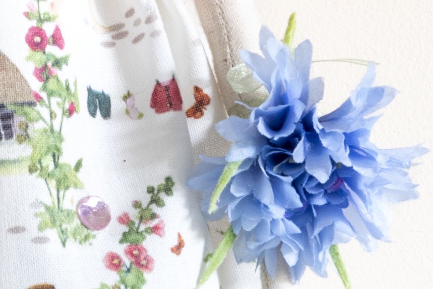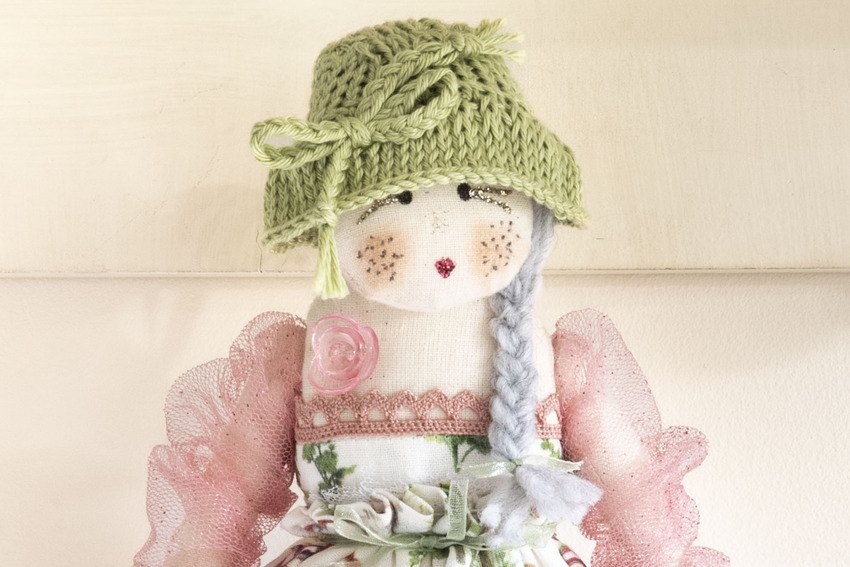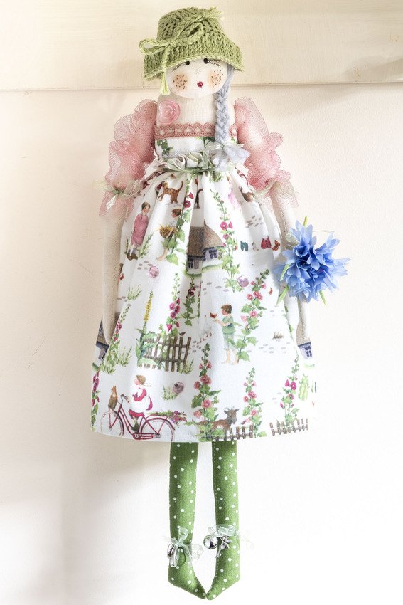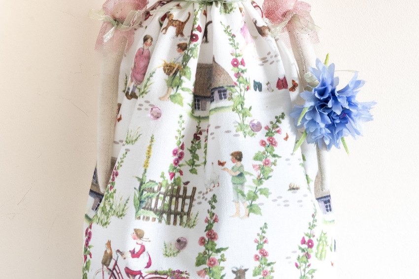 Miss August in her delicate dress with pink hollyhocks, cottages, butterflies and bicycles, sparkle sleeves, polka dot stockings, hand knitted hat and rose pink lace edging and as always not to forget glitter lipstick and eyelashes xx
