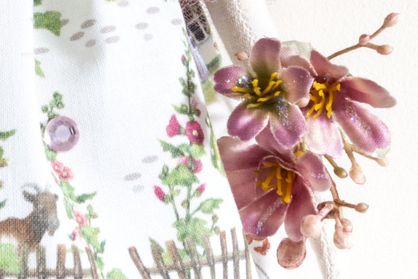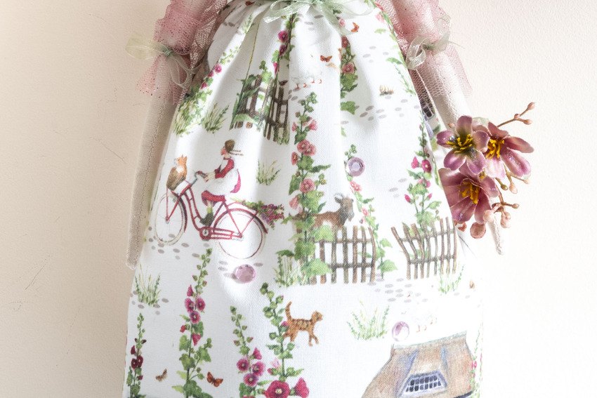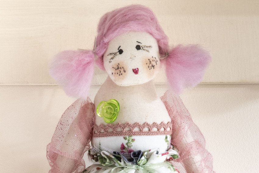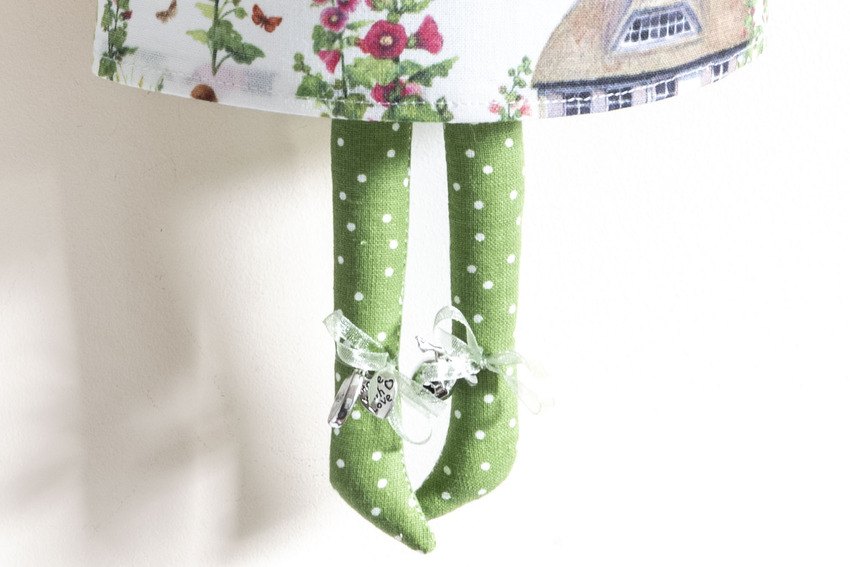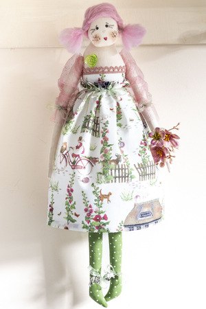 Miss June in her delicate dress with pink hollyhocks, cottages, butterflies and bicycles, sparkle sleeves, polka dot stockings, and rose pink lace edging and as always not to forget glitter lipstick and eyelashes xx