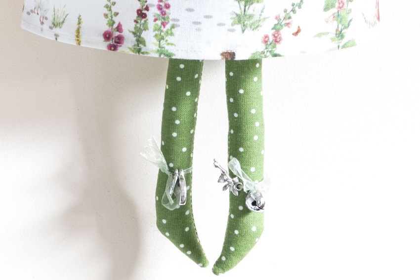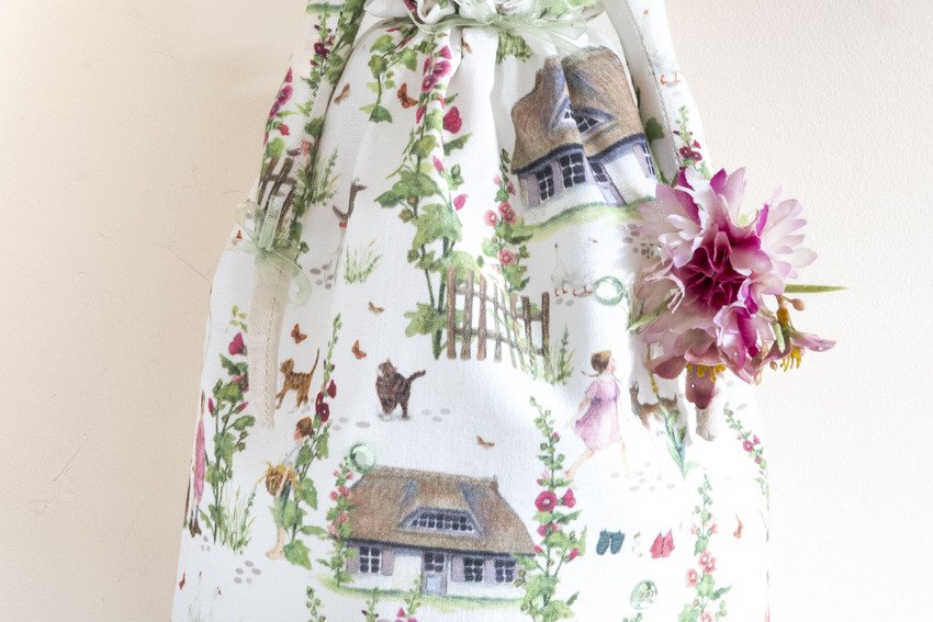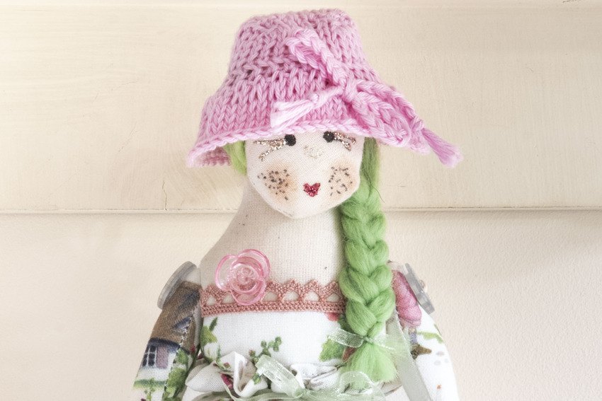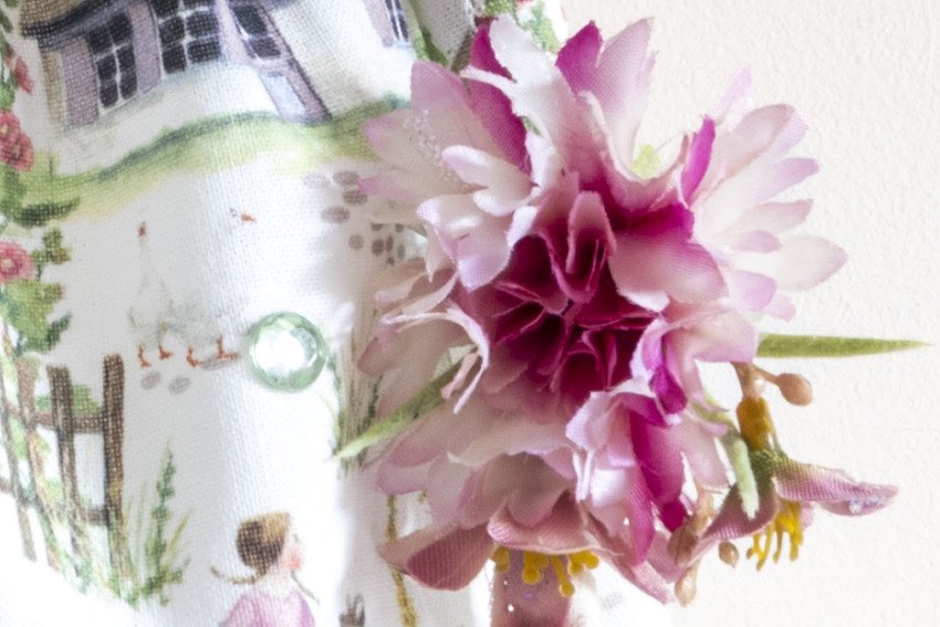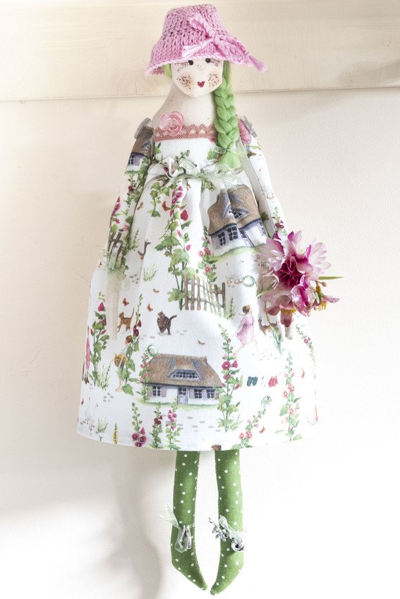 Miss May in her delicate dress with pink hollyhocks, cottages, butterflies and bicycles, matching sleeves, polka dot stockings, hand knitted hat and rose pink lace edging and as always not to forget glitter lipstick and eyelashes xx