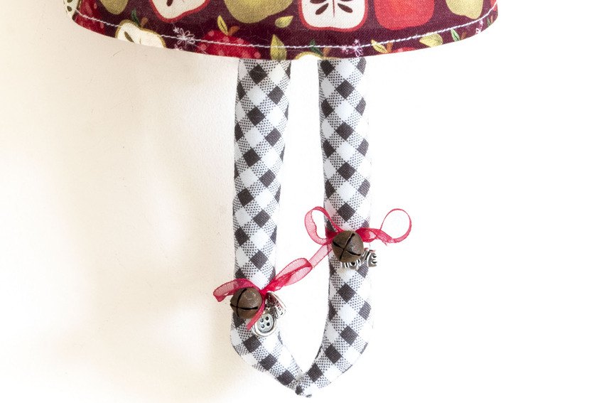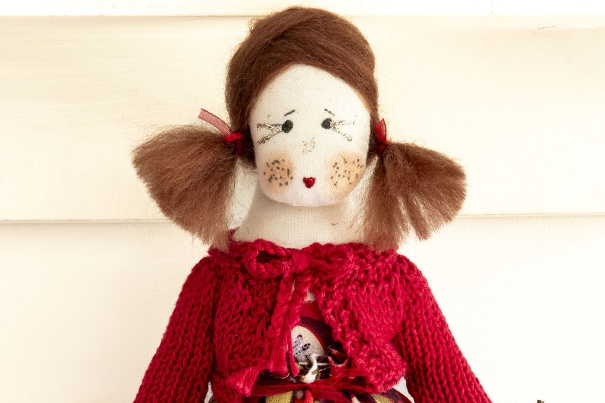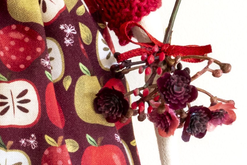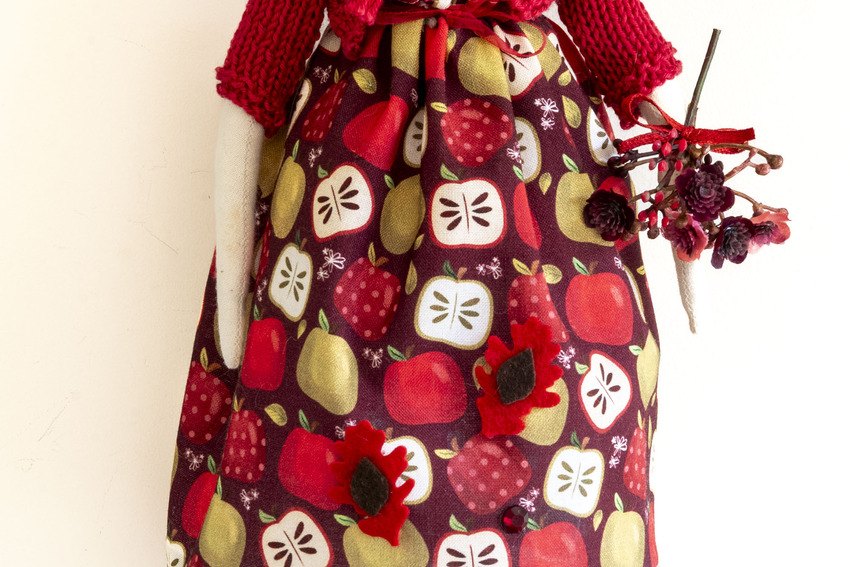 Pippa in her beautiful apple print dress and hand knitted cardigan with bow, felt trim leaves and as always not to forget glitter lipstick and eyelashes xx